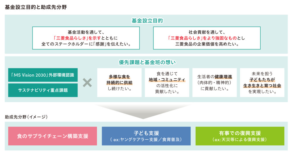 三菱食品は、100周年を記念した施策の一環として、「三菱食品 これからの100年基金」を9月30日に創設いたしました。 初年度は、3つの分野(1:非営利団体に対する食のサプライチェーン構築支援、2:子ども支援、3:有事での復興支援)の助成に総額1億円を拠出します。